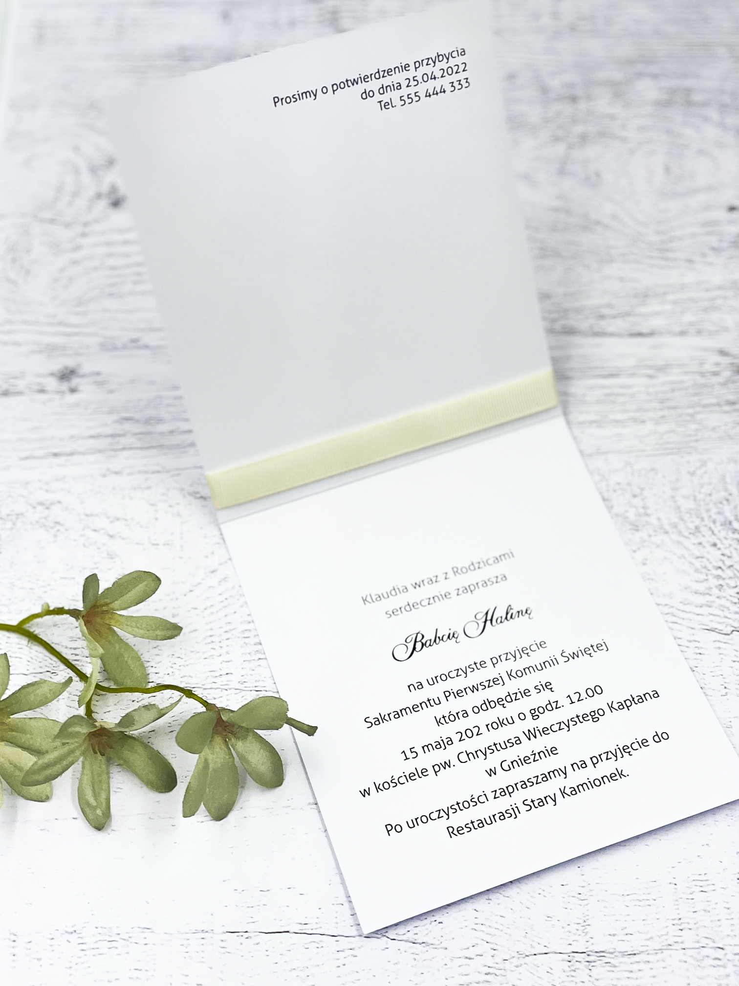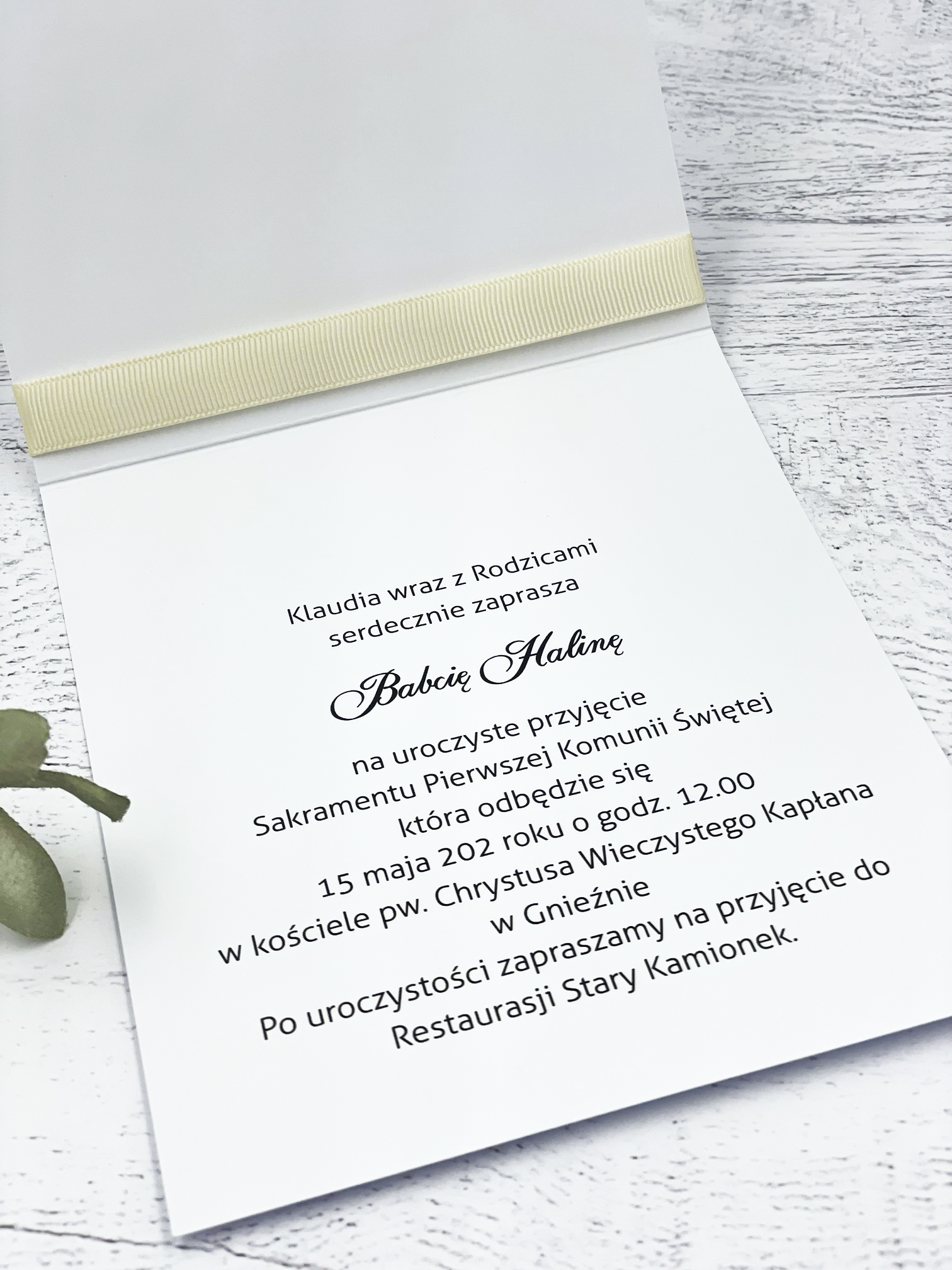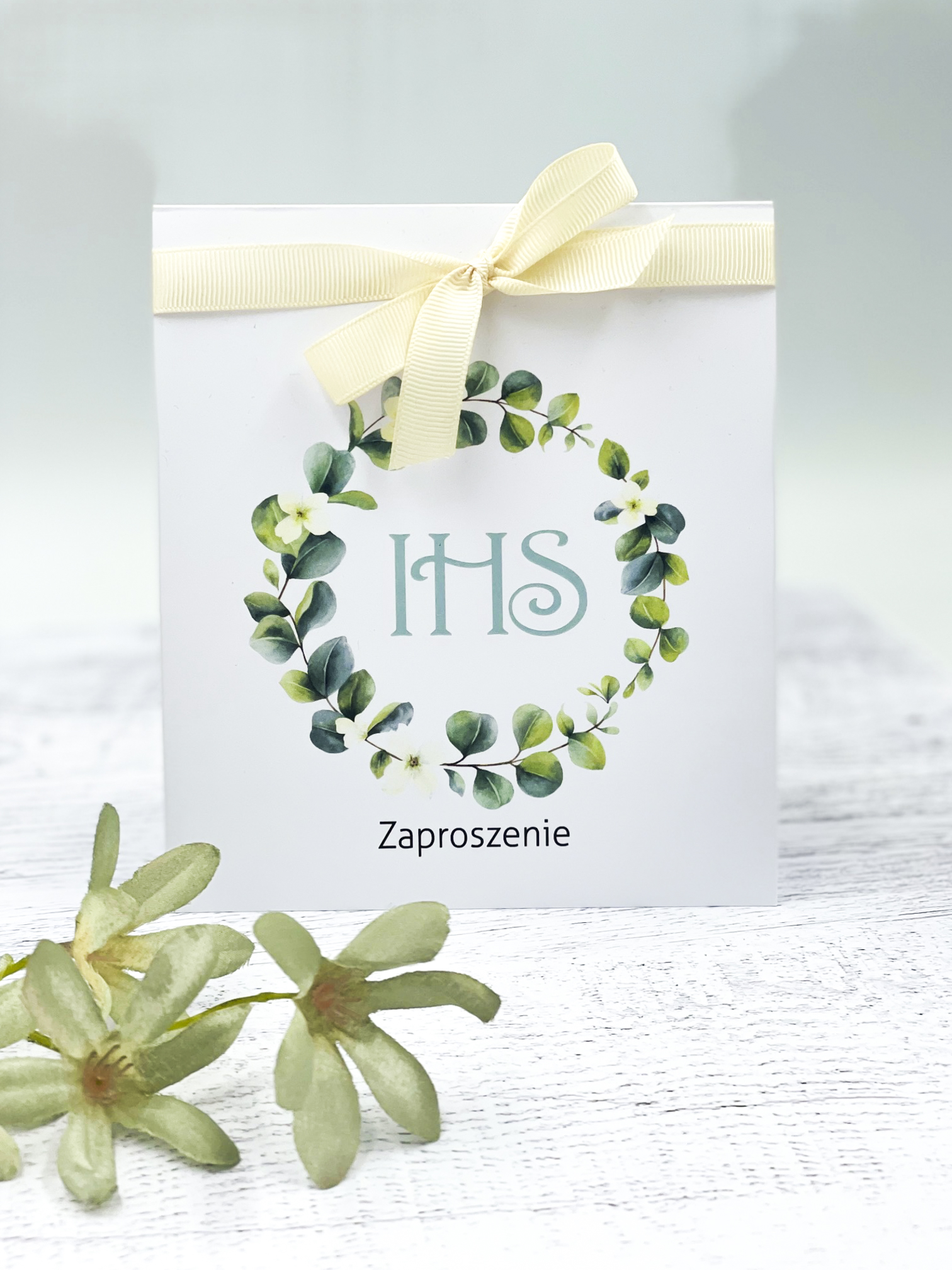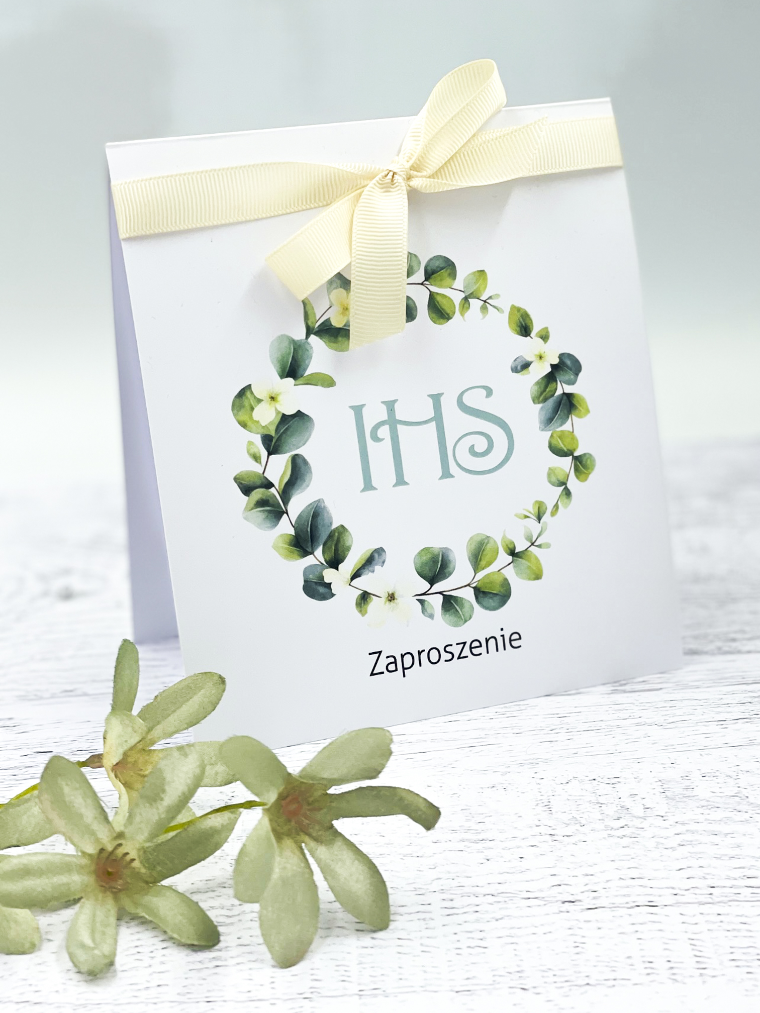 Zaproszenie z eukaliptusowym wiankiem i delikatną wstążka.